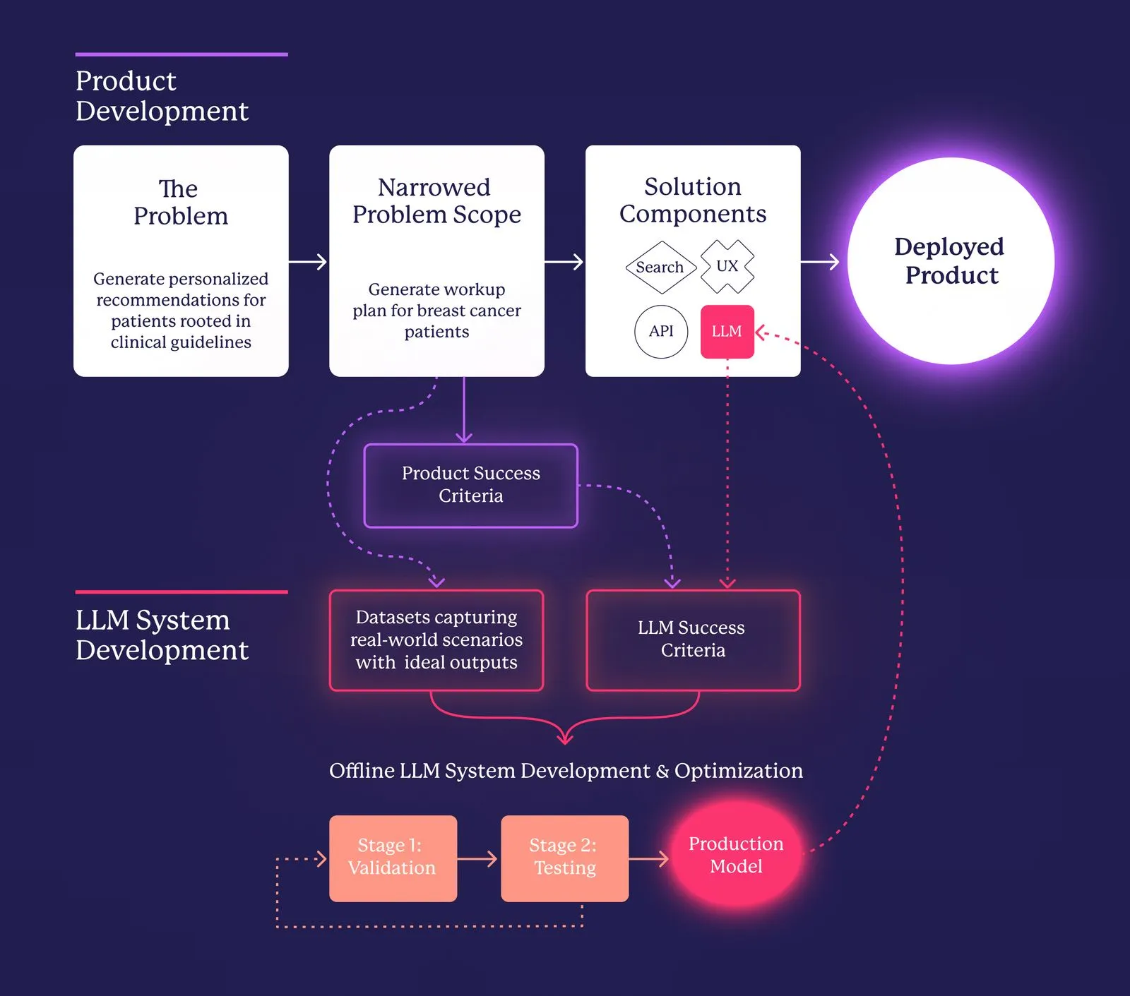 We have demonstrated how leveraging LLMs can significantly enhance the identification and addressing of challenges faced by healthcare providers. While these models offer remarkable capabilities, they also introduce a distinct set of complexities. By methodically navigating these challenges—ranging from extracting meaningful data to ensuring accuracy, interpretability, and alignment of outputs—we have developed a systematic approach that enables the creation of reliable, AI-driven solutions. The following diagram illustrates our process, from defining the problem to narrowing the scope and ultimately integrating LLMs to create a product that effectively addresses a real-world need.